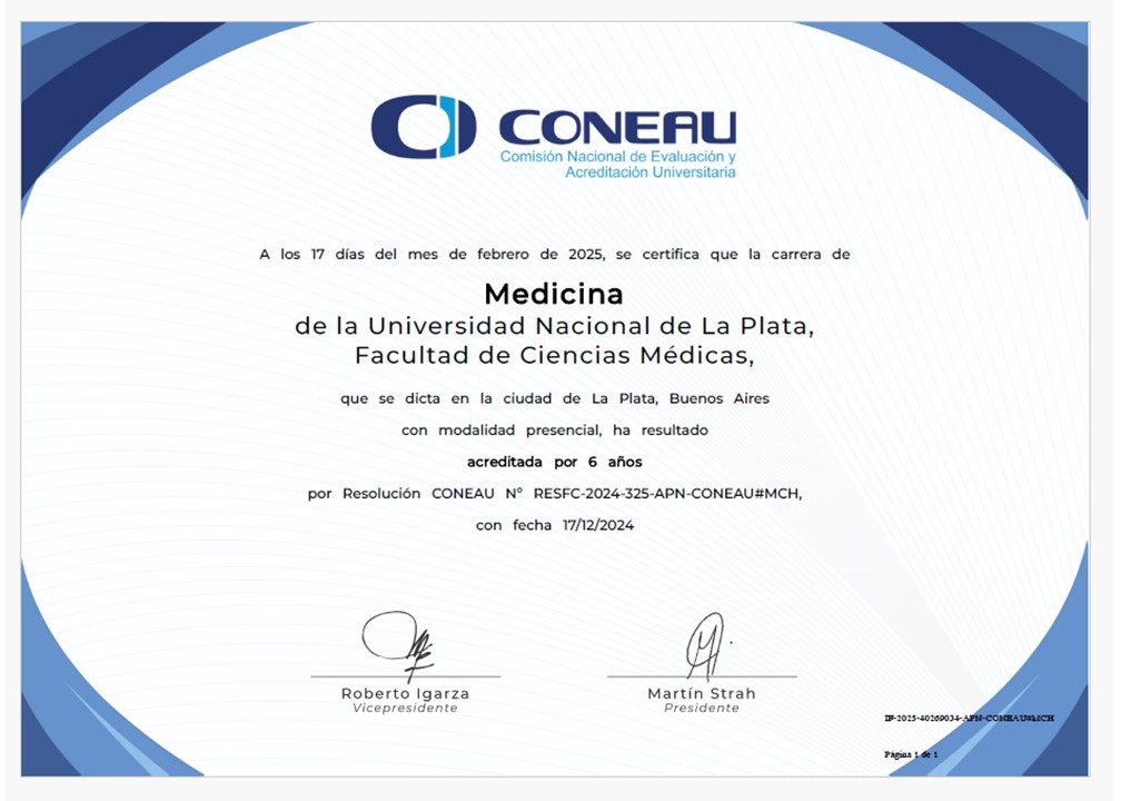 La Comisión Nacional de Evaluación y Acreditación Universitaria otorgó a la carrera de Medicina de la UNLP una acreditación de seis años, validando la calidad académica y los estándares internacionales que sostiene la formación profesional en la Facultad de Ciencias Médicas.